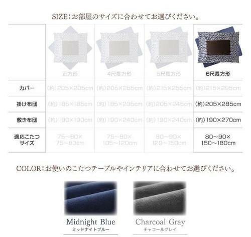 【サイズ】[正方形]・カバー:(約)195 195cm・掛け布団:(約)185 185cm・敷き布団:(約)190 190cm・適応こたつ天板サイズ:75〜80 75〜80cm[4尺長方形]・カバー:(約)195 245cm・掛け布団:(約)185 235cm・敷き布団:(約)190 240cm・適応こたつ天板サイズ:75〜80 105〜120cm[5尺長方形]・カバー:(約)215 255cm・掛け布団:(約)205 245cm・敷き布団:(約)190 240cm・適応こたつ天板サイズ:80〜90 120〜150cm[6尺長方形]・カバー:(約)215 295cm・掛け布団:(約)205 285cm・敷き布団:(約)190 270cm・適応こたつ天板サイズ:80〜90 150〜180cm【生地・詰めもの】・カバー:(表地・裏地)ポリエステル100%・掛け布団:(表地・中わた・裏地)ポリエステル100%【生産国】中国【注意事項】※サイズは概算です。