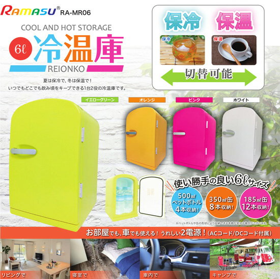 冷温庫 の詳細 商品名 冷温庫 RA-MR06 サイズ(約) 幅210×奥行265×高さ340mm 重量(約) 3.2kg 容量 6L 消費電力 〜45W(AC)/〜35W(DC) 保冷効果 約5〜10℃(周囲温度により異なります) 保温効果 約50〜60℃(周囲温度により異なります) 定格電圧 AC100V/DC12V 50/60Hz 電源コード付き 庫内容量 185ml缶最大12本/350ml缶最大8本/500mlペットボトル最大4本 材質 ABS樹脂 区分 家電 JAN イエローグリーン:4547035345516 オレンジ:4547035345523 ピンク:4547035345530 ホワイト:4547035345547 広告文責 株式会社エヌ・エス・ティー 076-254-0557