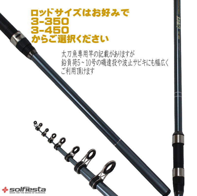 商品仕様 【ロッド】3325/3326 ■商品名 太刀魚魂350/太刀魚魂400 ■全長 3.5m/4.0m ■継数 4本 ■仕舞寸法 104cm ■先径 2.3mm 元径 17.9mm / 2.1mm 元径 19.2mm ■自重 230g/270g ■錘負荷 5〜10号 ■素材 カーボン繊維70% ■ソルフィエスタ 【リール】2916 ■【商品名】CASUALSPIN4000 ■【標準糸巻量】ナイロン4号-220m 5号-170m 6号-150m ■【自重】約g ■【ギア比】4.7:1 ■【ベアリングボール/ローラー】1/0 ■【付属ライン】5号相当約170m付 ハンドルの左右付け替え可能 商品説明 波止や堤防での釣りに最適な太刀魚専用竿(太刀魚専用竿の記載がありますが、鉛負荷5-10号の磯遠投や波止サビキ等幅広くご利用頂けます) 商品備考