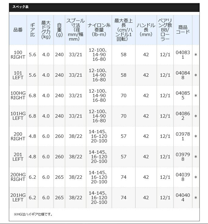 待望の100サイズ登場により、マキモノの覇者が適応力をさらにアップ!【SPEC】●品番:100HG RIGHT●ギア比:6.8●最大ドラグ力(kg):4.0●自重(g):240●スプール寸法(径mm/幅mm):33/21●ナイロン糸巻量(号-m):12-100、14-90 16-80●最大巻上長(cm/ハンドル1回転):70●ハンドル長(mm):42●ベアリング数BB/ローラー:12/1
