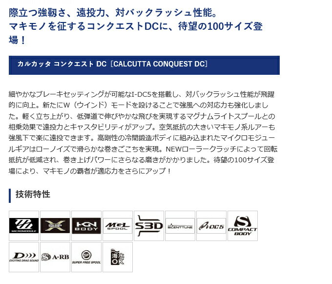 マキモノを征するコンクエストDCに、待望の100サイズ登場!【SHIMANO CALCUTTA CONQUEST DC 2020年追加モデル】細やかなブレーキセッティングが可能なI-DC5を搭載し、対バックラッシュ性能が飛躍的に向上。