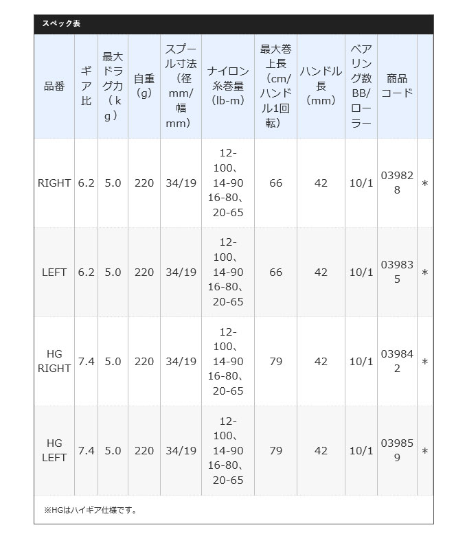 スペック ●品番:HG LEFT●ギア比:7.4●最大ドラグ力(kg):5.0●自重(g):220 ●スプール寸法(径/幅mm):34/19●ナイロン糸巻量(lb-m):12-100、16-80●最大巻上長(cm/ハンドル1回転):79 ●ハンドル長(mm):42●ベアリング数(S A−RB/ローラー):10/1 関連商品 ・シマノ アンタレス 2019年モデル ・シマノ アンタレス シリーズ 商品一覧 ・シマノ アンタレス シリーズ 中古 商品一覧 在庫について マルニシ楽天ショップにて掲載、販売しております商品は実店舗と在庫を共有しているため、 「在庫有り」の場合でもご注文後に欠品が発生する場合がございます。